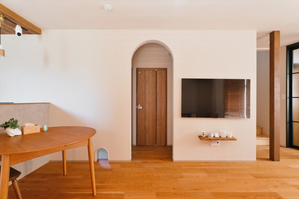 玄関は居室を一部取り込んで玄関土間を広げ、手前にはベンチ、奥にはコートクロークをつくりました。