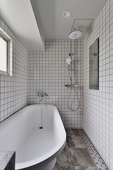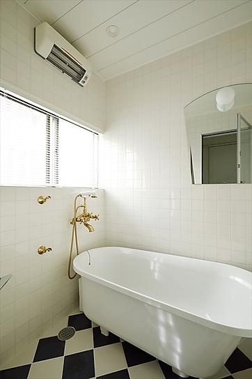 市松の床や真鍮の水栓が海外の邸宅のようなお風呂ですが、実はこちらは既存を再利用したもの。