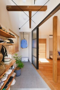 吹抜けで高さ、ガラス建具で横の広がりが感じられる玄関。木とアイアンを組み合わせた梁もインテリアのアクセントに。
