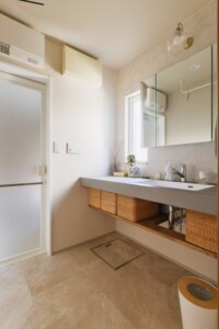 クロスや照明など、一つひとつのアイテムからも住む人のセンスが伝わってくるS邸。パブリックスペースである1階はグレージュのクロスで落ち着いたトーンでまとめ、収納内部にウィリアム・モリス柄のクロスで遊び心を忍ばせました。キッチンや洗面室のタイルはアイボリーホワイトで、表面が立体的なデザインのものを選んでいます。
