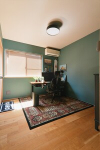 「2階の3室は夫婦それぞれの部屋と寝室にしました。好きな色のクロスを選んで、好きなものを飾って。でも、僕が使っている部屋のドアは既存のものを使っていますし、通風孔も自分でグレーに塗装しました。妥協できる部分はしながら、予算をやりくりしています」(夫)。