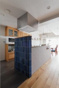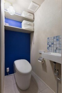 リビングドアやキッチンタイル、リノベーションを機に新調したデスクライトなど、所々にとり入れたアクセントカラーはブルー。特にトイレのクロスは、夫がこだわった“フェルメールブルー”です。美術館巡りや海外旅行もよく行くというN様夫妻。旅先で出会った絵画や写真などがさりげなく飾られ、おふたりらしい空間に彩りを添えます。