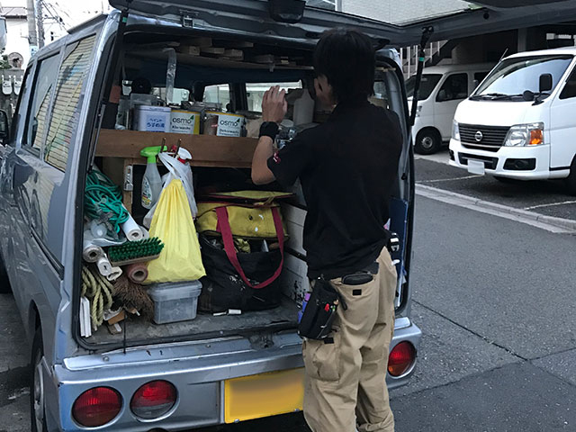 施工管理スタッフ一人ひとりに、軽ワゴン車が工事部カーとして用意されているので、それぞれが自分にとって使いやすいようにカスタムしています。