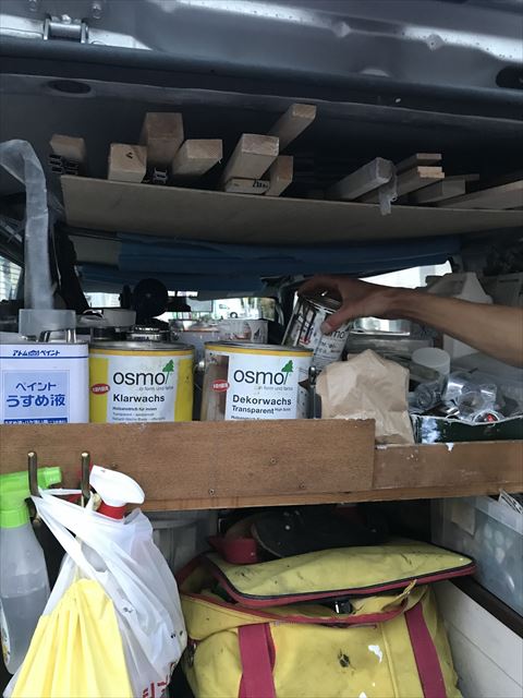 資材は現場に直接搬入されるので、工事部カーに乗っているものは、脚立や作業道具、工事中に現場で使う照明、塗装剤など。整理整頓しやすいよう取り出しやすく、使い勝手のよい棚を自分でつくりました。