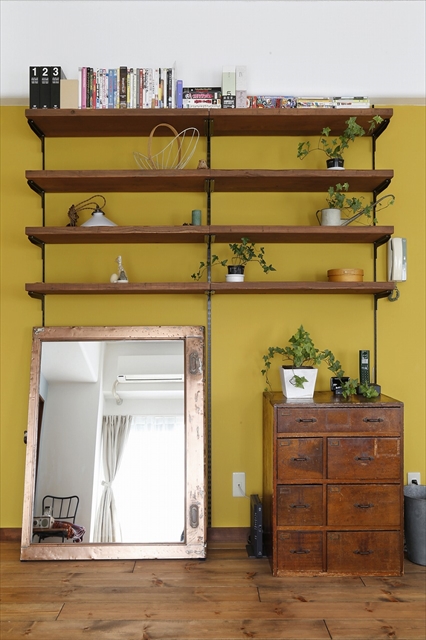 リビングの一部をからし色に塗装し、古材で可動棚をつくりました。