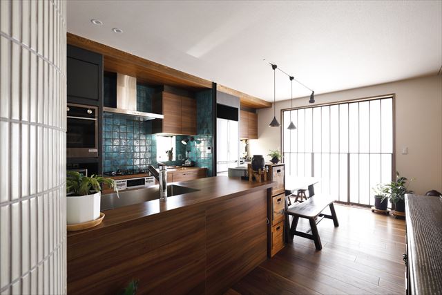 ご主人のこだわりに応えて、使ったのはタイルやブラックウォルナットなど重厚感のある素材。