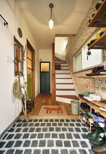 玄関入ってすぐに目に飛び込んでくるのが、階段側に貼られたこちらのクロス。