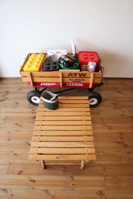 いまや小学生で、おもちゃを散らかすことはなくなった息子さんですが、もう少し小さい頃は「このワゴンに収める」と決めて片づけの習慣を身につけていったそう。リビングに出すおもちゃはこのラジオフライヤーに入る分だけにして、お家をスッキリ保っています。
