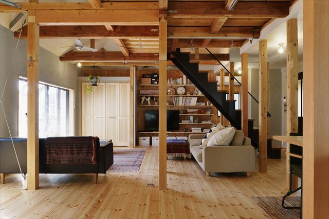 こちらのおうちのリビングには、窓や他の部屋の入り口が面していて、ほとんど壁がありません。