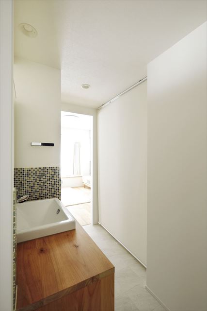 脱衣所と部屋干しスペースの間に、洗濯機とカウンターを備えたユーティリティをつくりました。