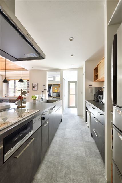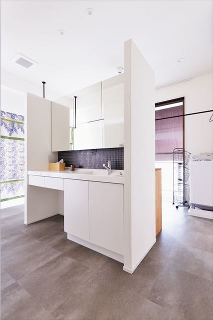 洗面脱衣室、キッチン、洗濯室を一直線に並べることで、コンパクトな家事動線が叶いました。