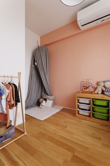 子ども部屋に入るとこんな感じで、サーモンピンクの壁がカワイイ!