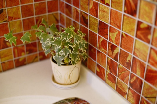 こちらのタイル、近づくと葉のモチーフを写したガラスモザイクになっています。