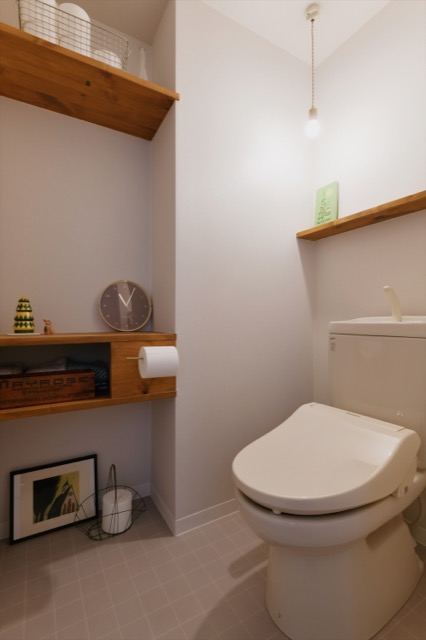 木を使った棚板の質感やペンダントライトで、トイレのおしゃれ度もアップ。
