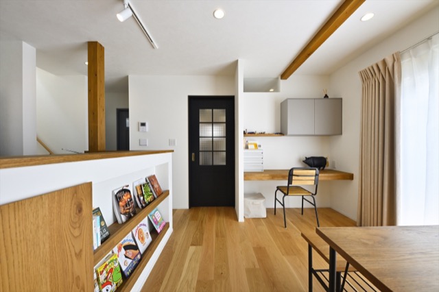 リビングドアの脇にはカウンターデスクを造作し、家族共用のワークスペースに。