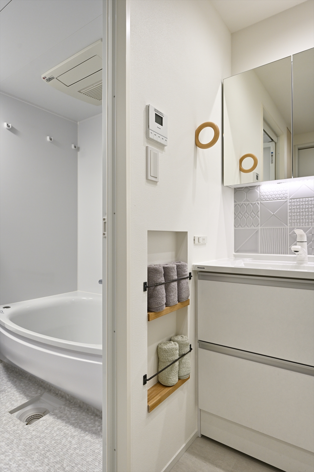ニッチは洗面室でも大活躍!くるくる巻いたタオルを入れて