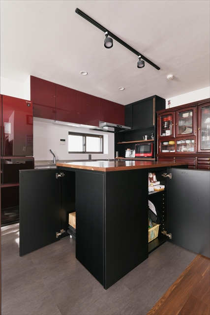 レッドとブラックを基本に、落ち着いた色調でコーディネートされたキッチンです。