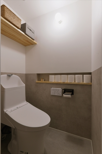 腰壁風に下半分をグレーにしたトイレで、ラインに合わせて横長のニッチをつくりました。