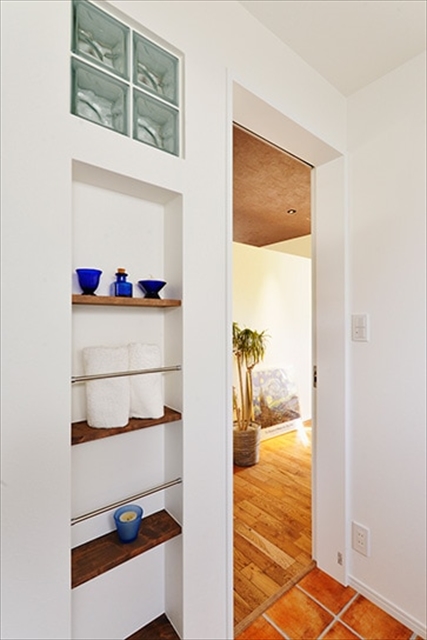 手洗いシンク+扉付き収納の対面の壁に、3列のニッチをつくった例です。