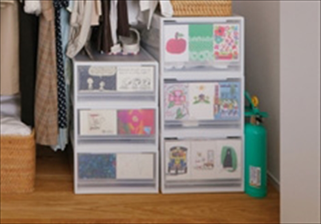 衣装ケースはごくシンプルなものですが、ポストカードを引き出しの前板部分に貼って楽しく演出。