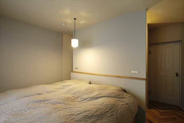 ポイントは寝室のドアを入ってすぐ、ベッドの幅に合わせて立てた内壁にありました。