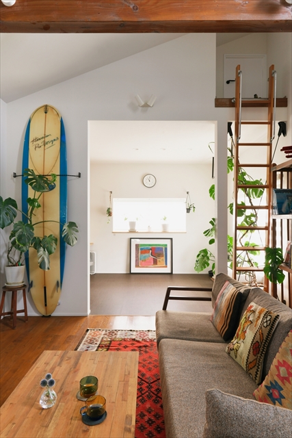 サーフボードを飾った西海岸風インテリアに、葉に光沢のあるモンステラやフィカスがよく似合います。
