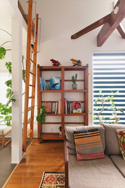 存在感のあるグリーンがあるだけで、勾配天井のリビングがより立体的に、居心地よく見えますね。