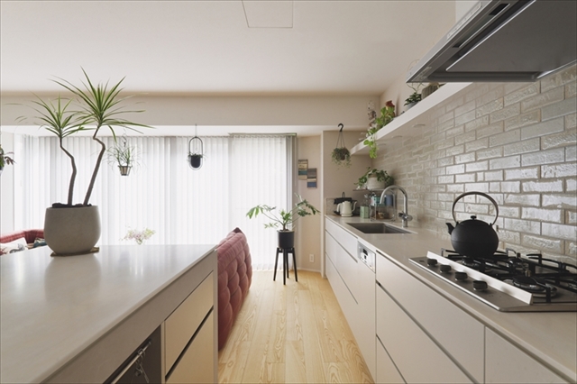 キッチン上部のオープン棚から垂れ下がるポトスの葉も、空間のフレッシュなアクセントに。