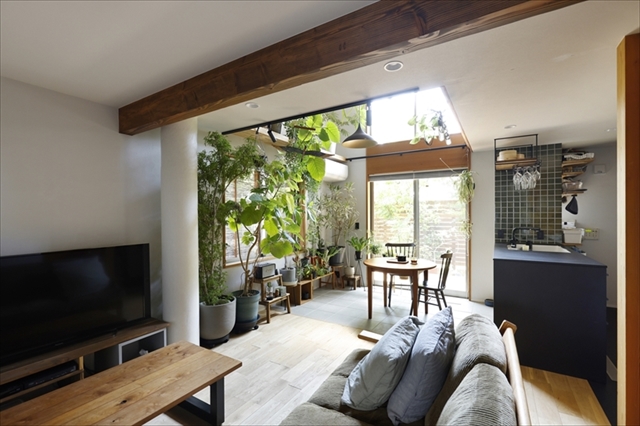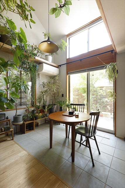 最後は吹抜けの全面開口から光が降りそそぐダイニングを、観葉植物のためのコーナーにした例。