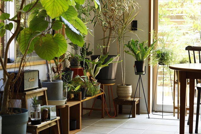 先ほどのおうちと同じく、ポットスタンドやスツールなどを使って高さにメリハリをつくっています。