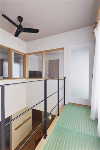 吹き抜けの一部はグレーチング床にして、陽当たりをいかした室内干しスペースを確保。