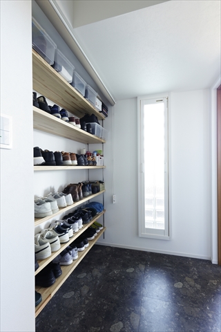 北側玄関のガラスブロックにも内窓を入れ、壁一面のオープン棚により収納力も確保しています。