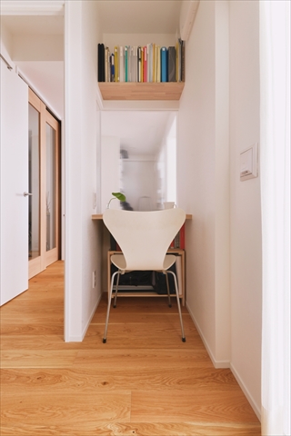 妻の寝室からは、玄関側にデスクコーナーを備えた夫の寝室へとつながります。