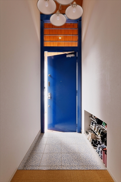 玄関ドアのブルーを見た瞬間「ここに住みたい!」とインスピレーションを感じたそう。