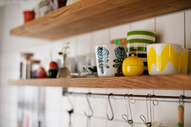 白いタイルが爽やかなキッチンのオープン棚にも、マリメッコなどのカップが。