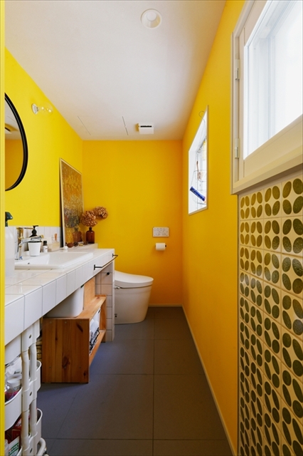 洗面室やワークスペースの照明のイエローなど、ビビッドな色の効かせ方もお手本にしたいですね。