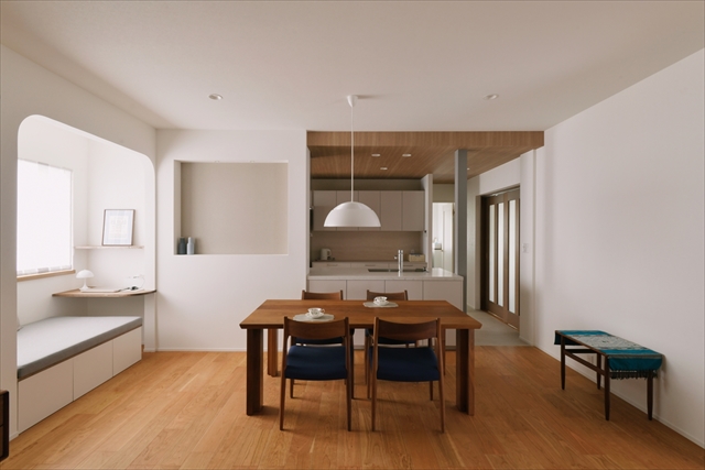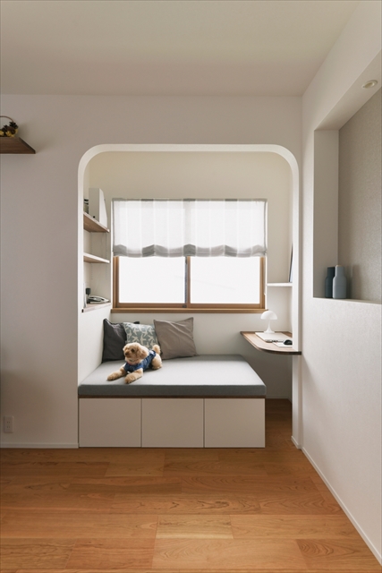 続いては、リビングにつくったヌックがくつろぎムードをいっそう高めてくれるおうち。