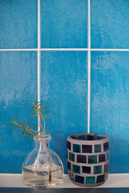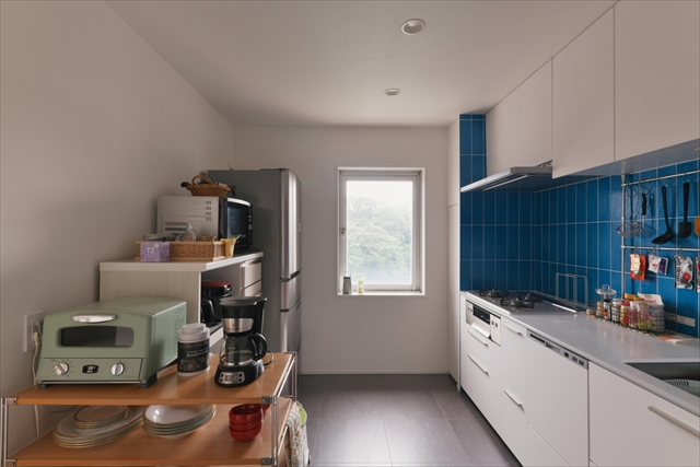 キッチンには、新婚旅行で訪れたサントリーニ島をイメージしたマリンブルーのタイルを採用。