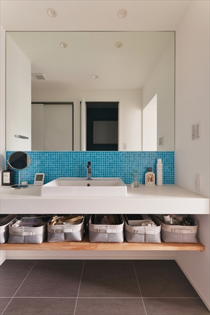 家族で使える書斎スペース、キッチンとつながる洗面室にもブルーが。