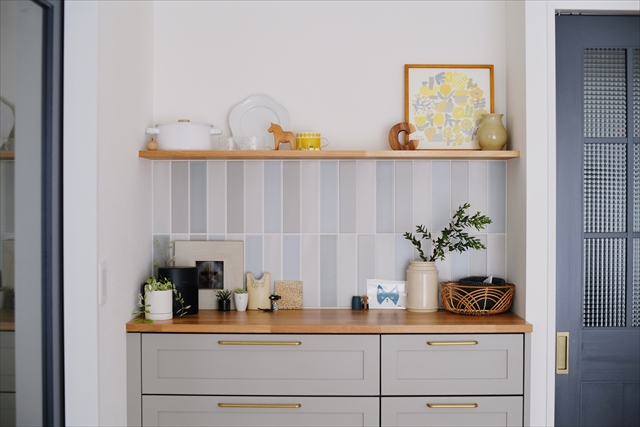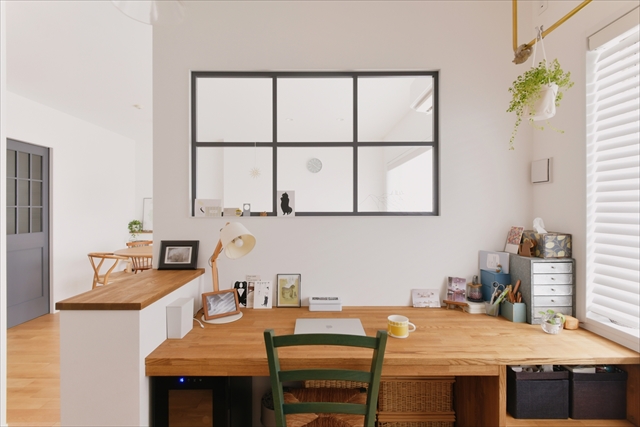 ブルーグレーのカップボードやワークスペースの室内窓など、他にもお気に入りアイテムがたくさん。