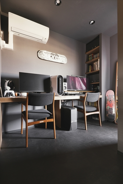 リビングの一角には壁を立て、室内窓でつながるワークスペースに。