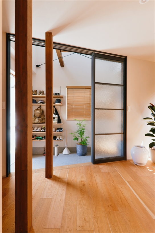 そこで、土間との間にLDKとのつながりを意識した大きなガラス間仕切りを設置。