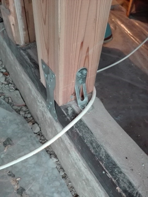 K様邸では、フラット35適合のため、新たに基礎を打ち増ししているのと内部は完全にスケルトンにしているため、新築工事にも近い補強をすることが可能になりました。土台の差し替えも含め、アンカーボルトやホールダウンの金物、その他必要に応じて金物の取り付けをし、バランスの良い耐震補強をしています。