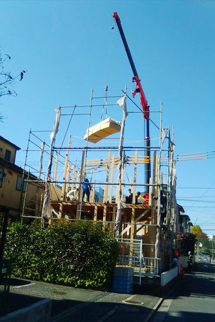 高所にはクレーン車で構造材を持ち上げます。M様邸では、道路側に電線があったので、L型のクレーンを使い、電線を上手く避けながら作業を行いました。