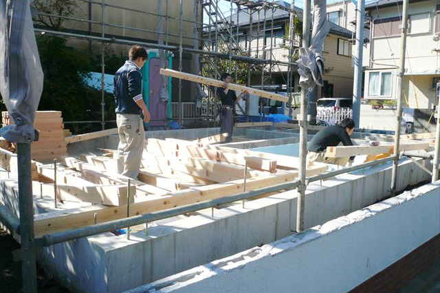 建築現場においてまず建てられるのが足場です。これは手の届かない高所で安全に的確に作業するために欠かせないもの。足場職人さんたちが、基礎の外周を囲むようにテキパキと足場を組み上げました。