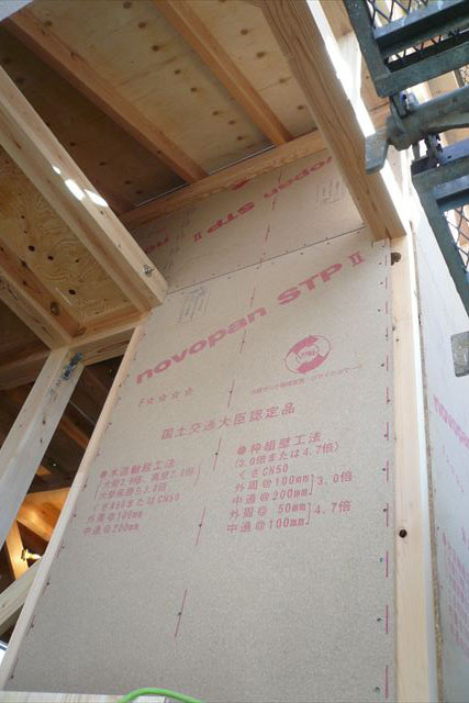 地震や台風などの力を受けやすい接合部分(土台と柱、柱と梁など)はホゾ組みによる接合に加え、ホールダウン金物を使って強度を高めます。また、壁の強さを高めるため、構造用耐力面材を使い、面で支えて耐震性を高めていきます。