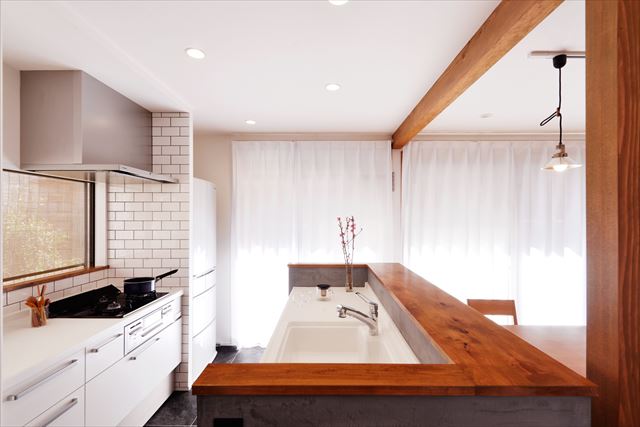 「以前のキッチンに比べたら、格段と使いやすいです!」と満足の奥様。標準で付いていた食器洗い乾燥機を無くし、コストダウン。白のタイルやカウンター前のグレーのモルタル、構造上外せなかった柱は梁を付けてアクセントにしました。