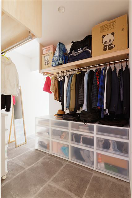 雨の日でも洗濯物が干せるサンルームと寝室は障子で仕切ることができます。念願だった大型のファミリークロゼットは、アイロンがけなどの家事スペースも兼ねており、家族全員の衣類を収納。洗濯物を取り込んでからしまうまでがスムーズですね。