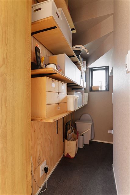 ダイニングの壁面収納は、CDがすべり落ちないように、棚板に溝が。 CDのジャケットが見えるように飾る事もできます。