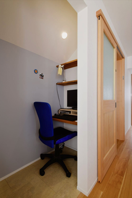 LDKとも隣接しているので、家族の気配を常に感じつつも囲まれた空間で集中してお仕事ができる空間になっています。